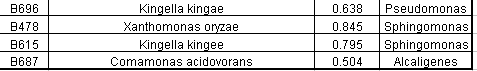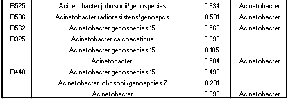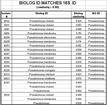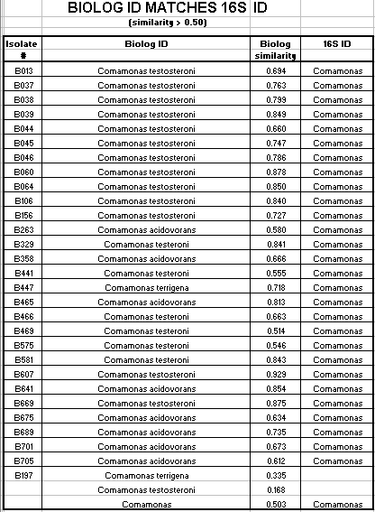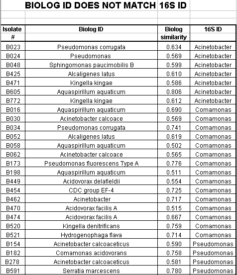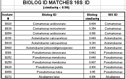 Of the Comamonas isolates tested, 29 of 47 (62%) had a matching 16s rRNA ID and Biologä ID with a Biologä similarity value of greater than 50%. Of the Acinetobacter isolates tested, 36 of 46 (78%) had a matching16s rRNA ID and Biologä ID with a Biologä similarity value of greater than 50%. Of the Pseudomonas isolates tested, 17 of 27 (63%) had a matching16s rRNA ID and Biologä ID with a Biologä similarity value of greater than 50%. Only 2 of the 124 isolates had an Alcaligenes 16s rRNA ID. Neither isolate had a matching Biologä ID with a similarity over 50%. Also only 2 of the 124 isolates had a Sphingomonas 16s rRNA ID. Neither of these isolates had a matching Biologä ID.