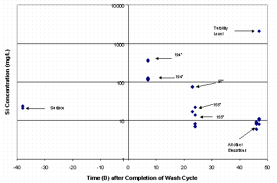 Table 6 contains the results of those analyses. Experimental difficulties were encountered with two of the samples (ESP-248 and ESP-249) and precluded complete analysis of these samples. However, the total silicon concentrations were quite low with the exception of one sample taken at an elevation of 97" from the bottom of the tank. The silicon concentration in that sample (ESP-247) measured 71 mg/L. Figure 1 shows a plot of the silicon concentration in Tank 40H with the time zero point being the end of the first washing cycle. The data strongly suggests that the silicon concentrations are arising from very small particulate silicon-containing materials.