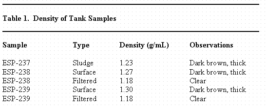 Table 1 contains the measured density and a brief description of the samples as received from Tank 40H. For Tank 40H, SRTC received two surface samples (ESP-238 and ESP-239). The density measured 1.27 and 1.30 g/mL for the surface samples (ESP-238 and ESP-239, respectively) prior to filtration and 1.18 g/mL after filtering through a 0.45 micron filter.