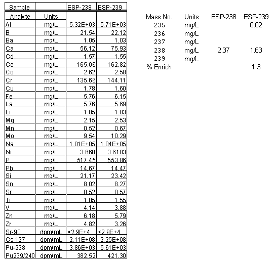 The uranium concentration was measured for diluted sub-samples from the filtered supernate samples (ESP-238 and ESP-239). The dilution-corrected concentrations are also shown in Table 2. The uranium concentration is very low and measured only 2 mg/L on average. The % enrichment is also very low and measured 1.3 based on analysis of the sub-sample from ESP-239. No 235U were detected in the 50:1 sample of ESP-238.