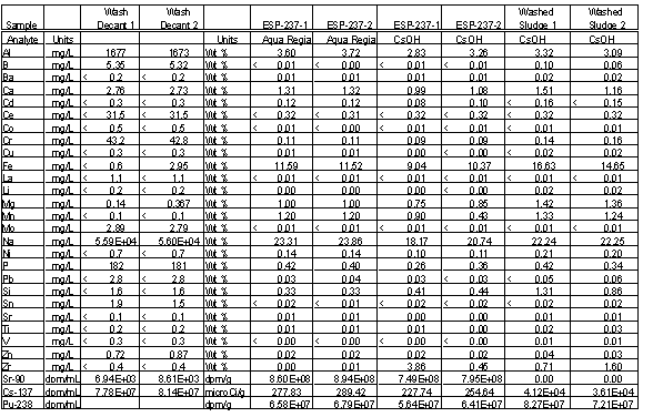 The sludge washing experiment was conducted as follows. A 10-mL aliquot of the well-mixed sludge sample (ESP-237) was transferred to a 40-mL graduated centrifuge tube. Twenty milliliters of caustic water (nominally 1 M sodium hydroxide and 0.4 M sodium nitrate) was added to the centrifuge tube. This composition simulates the predicted final composition of the wash water at the end of the first wash. Each tube was shaken vigorously for 10 minutes to thoroughly mix the sludge and wash water. Afterward, the tubes were placed into the centrifuge for 10 minutes at 2000 rpm. Twenty-five milliliters of clear liquid was removed from the tube with portions removed from the cell without dilution for analysis. The remaining washed sludge was dried, sampled for each dissolution method and submitted for analysis.