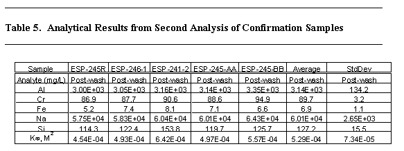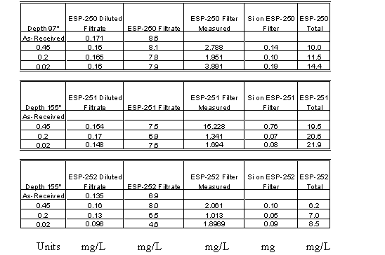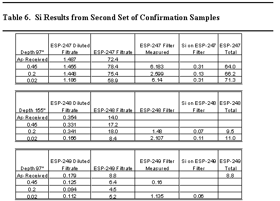 The first set of confirmation samples (ESP-245 and ESP-246, taken after 7 days from pump operation At an elevation of 194") were received at SRTC and placed into the Shielded Cells. The sample ESP-245 was opened and duplicate dilutions were performed into dilute nitric acid. The results for these samples initially showed silicon concentrations 316 and 348 mg/L. Inspection of the acidic subsample showed evidence of particulate matter dispersed in the sample. Table 5 contains the results of additional analyses of the confirmation samples. Attempts were made to avoid getting solids into the subsamples during analyses. The silicon concentration in these samples averaged 127.2 mg/l.