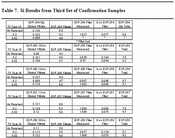 Many of the confirmation samples were put through a filtering protocol to determine the total amount of silicon in a given volume of liquid waste. The protocol included sampling as-received waste, sequential filtration through at least 0.2 micron and 0.02 micron filters, and analyzing filtrates and filters for aluminum and silicon. In some instances 0.45 micron filters were, also, used. Tables of data are presented with the following information: Si concentration (mg/L) in diluted sample, corrected Si concentration (mg/L, Si diluted x dilution factor), Si concentration (mg/L) from digested filter, Si amount (mg) on filter (Si concentration * 0.05 L volume) and Si concentration total (mg/L, [Si]0.02 filtrate + S Sifilter/Sample volume).