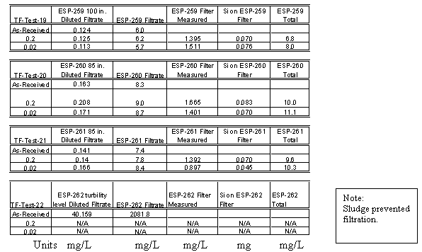 The silicon concentrations in the confirmation sample were not anticipated based on the work presented above. Therefore, a second series of samples were taken after ~ 25 days at two elevations in the tank. The samples were analyzed as received and after sequential filtrations. The filters were also digested using a sodium peroxide fusion.